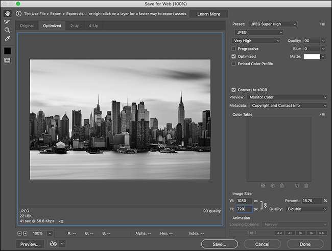 Dengan Photoshop, Lightroom, atau editor komputer lainnya, itu sederhana. Cukup atur pengaturan simpan atau ekspor ke dimensi yang tepat. Anda dapat menggunakan pengaturan kualitas untuk mengontrol ukuran file.