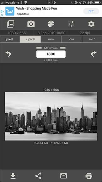 Di ponsel cerdas, segalanya menjadi sedikit lebih canggung karena Anda perlu menggunakan aplikasi terpisah. saya suka Ukuran Gambar untuk iOS dan Photo & Picture Resizer untuk Android . Buka foto di aplikasi mana pun yang Anda gunakan, lalu pangkas dan ubah ukurannya ke dimensi yang benar. Anda juga dapat menggunakan pengaturan kualitas untuk mengontrol ukuran file seperti yang Anda lakukan dengan aplikasi desktop.