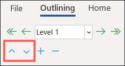 Secara default, Anda akan mulai dengan level 1, dan Anda akan selalu tahu level mana yang Anda gunakan dengan melihat kotak drop-down "Level Garis Besar" di sebelah kiri pita. Anda juga dapat menggunakan daftar drop-down untuk mengubah level Anda saat ini.