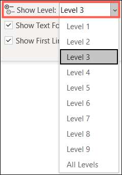 Alat lain yang nyaman untuk berfokus pada level tertentu adalah daftar drop-down "Show Level". Daftar ini memungkinkan Anda memilih level mana yang ingin Anda lihat. Misalnya, jika Anda memilih Level 3 di kotak drop-down, Anda akan melihat level 1, level 2, dan level 3 saja. Ini menyembunyikan segalanya dari Level 4, Level 5, dan seterusnya.