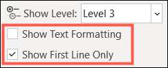 Dua opsi lainnya di bagian Alat Garis Besar adalah "Tampilkan Pemformatan Teks" dan "Saja Baris Pertunjukan." Jika Anda lebih suka melihat garis besar Anda tanpa memformat dokumen Anda untuk penampilan polos, hapus centang pada kotak itu. Jika Anda memiliki item panjang di level Anda dan hanya ingin melihat baris pertama, periksa kotak itu.