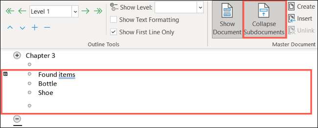 Setelah subdokumen tertanam, gunakan tombol "Collapse Subdocuments" untuk meruntuhkan konten dokumen dan hanya menampilkan tautan ke sana.