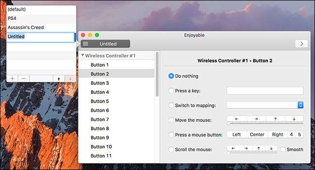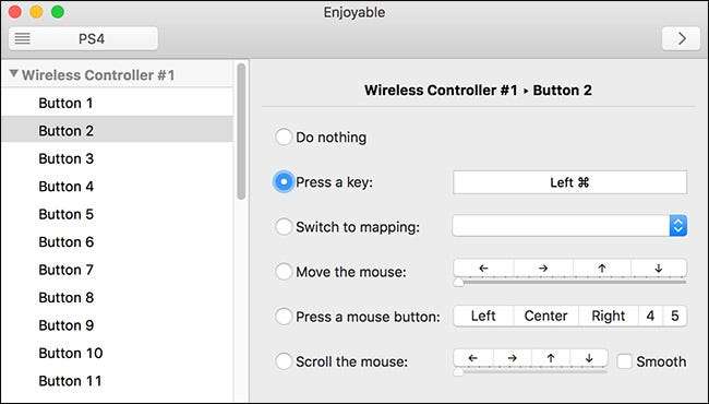 Setiap tombol dan sumbu tongkat analog harus ditetapkan secara individual. Dengan Buka yang menyenangkan, tekan tombol yang ingin Anda konfigurasikan pada pengontrol PS4. Aplikasi akan memilih opsi yang benar dari daftar (misalnya, tombol X pada pengontrol adalah Tombol 2 di menu). Tekan tombol yang Anda inginkan untuk memetakan tombol itu di panel kanan. Sekarang, ketika Anda menekan tombol itu, Mac Anda akan mendaftarkannya sebagai penekanan tombol itu.