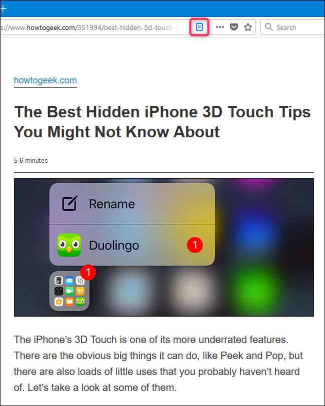 Setelah mengkliknya, ikon berubah menjadi biru dan halaman dimuat ulang dengan artikel yang diformat untuk Tampilan Pembaca. Perhatikan bagaimana halaman tersebut telah dibersihkan dan beberapa hal telah hilang. Bilah navigasi dan bilah sisi hilang, semua teks telah dipusatkan agar lebih mudah dibaca, dan perkiraan waktu membaca artikel telah ditambahkan di bawah judul.
