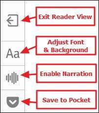 Firefox menambahkan sidebar dengan beberapa pilihan untuk keluar dari Tampilan Pembaca; menyesuaikan font, ukuran, dan warna latar; mengaktifkan narasi audio; dan menyimpan halaman ke Pocket untuk dibaca nanti .