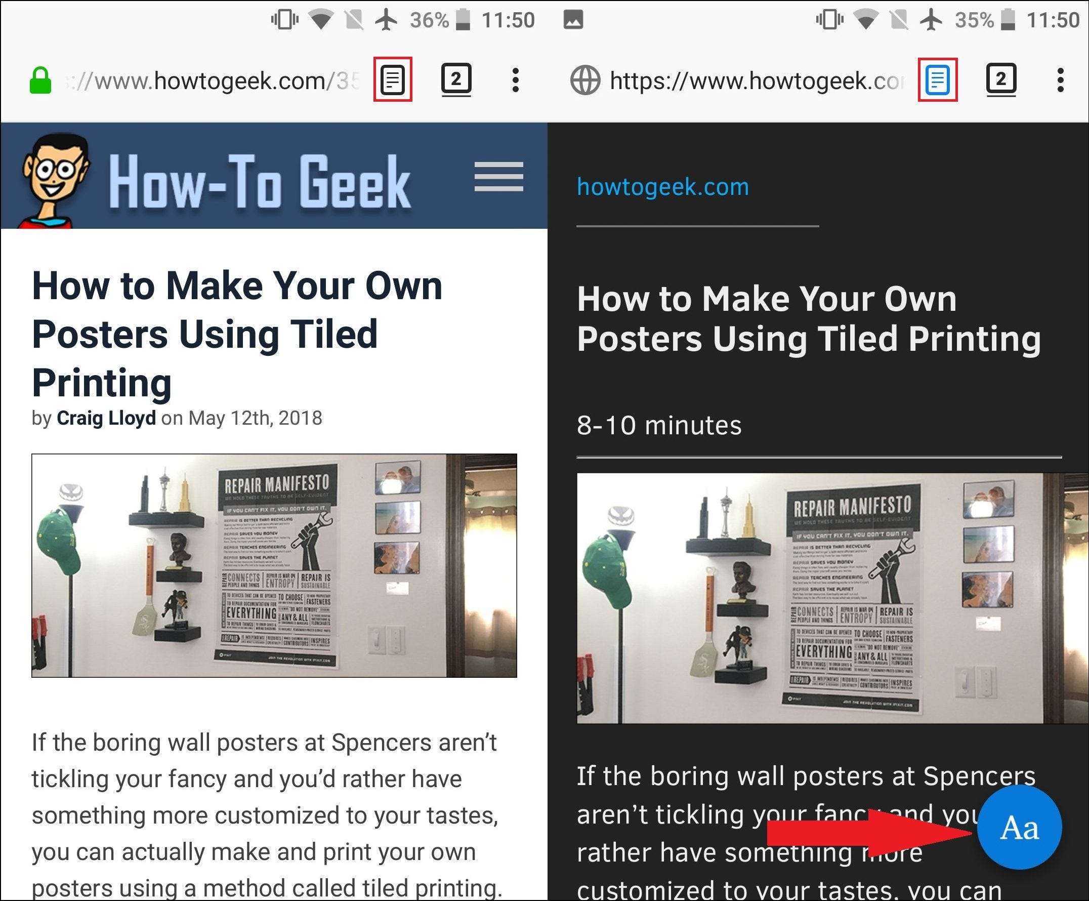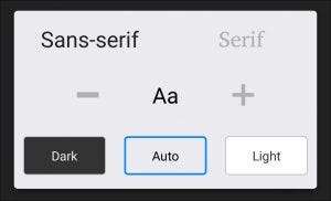 Ketuk ikon "Aa" biru bulat itu di bagian bawah halaman untuk membuka opsi untuk mengontrol Tampilan Pembaca. Anda dapat mengubah font, menambah dan mengurangi ukuran teks, dan mengganti latar belakang antara gelap dan terang.
