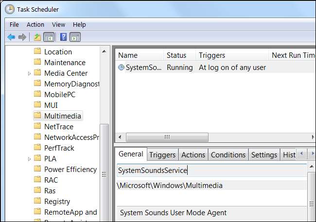 Tugas juga dapat dijalankan sebagai respons terhadap acara. Misalnya, tugas SystemSoundsService di folder Multimedia berjalan saat pengguna logon - ini memberikan suara login dan suara sistem Windows lainnya.