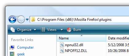 Perhatikan bahwa jika Anda menjalankan Vista 64-bit, jalurnya akan memiliki (x86) seperti tangkapan layar berikutnya, atau jika Anda menggunakan Firefox Portabel, Anda harus mencari folder instalasi Firefox dan menavigasi ke direktori plugin di sana.
