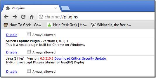 Untuk Google Chrome, buka about: plugins di bilah browser Anda, lalu tekan tombol Enter.