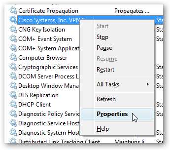 Setelah Anda menemukan layanan yang ingin Anda tunda, klik kanan padanya dan pilih Properties (atau cukup klik dua kali)