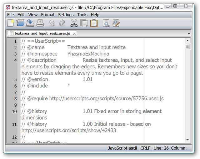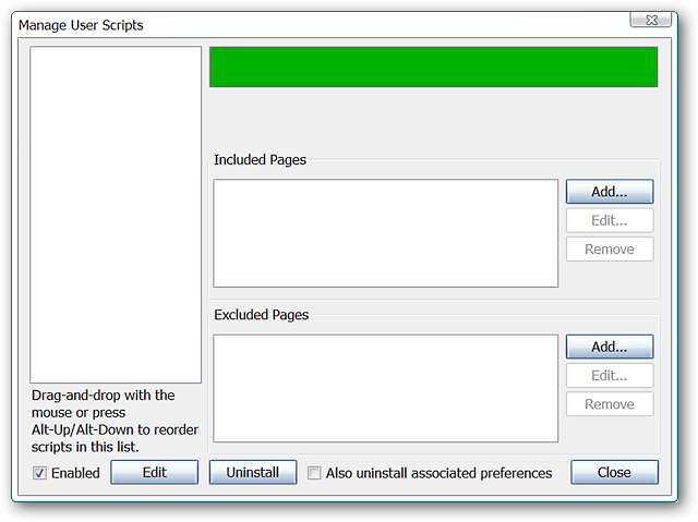 Baik Anda menggunakan tombol Opsi di Jendela Manajer Pengaya atau menu konteks yang ditunjukkan di atas, keduanya akan memunculkan dialog Kelola Skrip Pengguna. Saat ini Anda memiliki catatan bersih yang bagus untuk dikerjakan… waktu untuk menambahkan beberapa skrip.