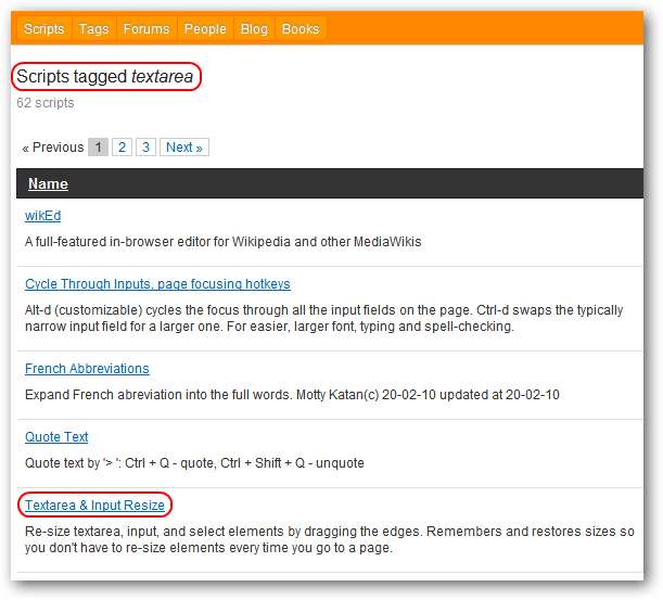 Untuk contoh kami, kami berfokus pada tag "textarea". Ada 62 skrip yang tersedia, tetapi kami dengan cepat menemukan apa yang kami cari di halaman pertama.