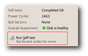 Tombol 'Jalankan Pengujian Mandiri' memungkinkan Anda memulai pengujian mandiri singkat, diperpanjang, atau alat angkut pada hard disk.