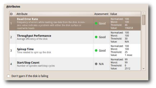 Alat SMART menilai kondisi hard disk Anda berdasarkan: throughput hard disk, tingkat kesalahan pencarian kepala magnetis, dan atribut lain yang dibuat oleh produsen hard disk Anda ke dalam hard disk mereka.