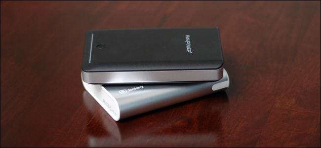 Sebagai bagian dari proses penulisan panduan ini, kami menggunakan dua paket baterai berkapasitas lebih tinggi RAVPower Deluxe Bank Daya 14.000 mAh ($ 29,99), terlihat di kanan atas, dan Jackery Giant 10.400 mAh Power Bank ($ 39,95), terlihat di kiri atas.