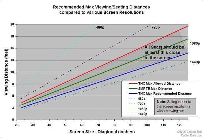 Pengukuran ini akan memberi Anda sekumpulan parameter kasar untuk jarak pandang minimum dan maksimum yang akan Anda (dan pemirsa lain di rumah Anda) temukan. Idealnya, Anda menginginkan rangkaian HDTV yang memberikan tampilan terbaik di seluruh rentang tersebut. Jadi, bagaimana Anda menentukan kisaran itu? Produsen televisi, pengecer elektronik, dan bahkan organisasi THX semuanya telah mengeluarkan rekomendasi jangkauan tontonan mereka sendiri. Meskipun semuanya kurang lebih sejalan satu sama lain, kami kebetulan menyukai spesifikasi THX karena mereka fokus pada kesenangan menonton yang maksimal melalui tampilan yang imersif. Jika Anda membeli HDTV kecil untuk dapur Anda untuk menonton berita pagi menonton yang imersif mungkin bukan prioritas bagi Anda, tetapi bagi sebagian besar pembeli HDTV besar, pengalaman film yang menginspirasi dan imersif adalah penting. Atau, dengan kata lain, agak jarang mendengar seseorang berkata, "Wah, saya berharap saya membeli televisi yang lebih kecil!" Anda dapat merujuk pada bagan di atas, milik Carlton Bale, atau membaca artikelnya yang sangat informatif di sini untuk menggunakan kalkulator layar untuk kalkulasi inci demi inci.