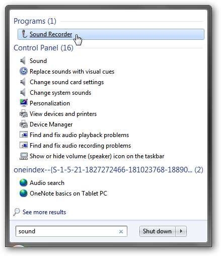Catatan: jika Anda menonaktifkan pencarian, Anda dapat menemukannya di All Programs> Accessories> Sound Recorder.