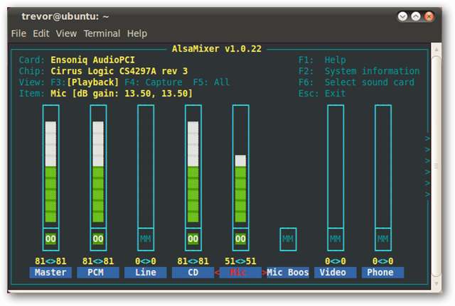 Periksa apakah entri Mic memiliki volume yang wajar. Jika tidak, gunakan tombol panah Anda untuk menyorot entri Mic dan naikkan volume menjadi sekitar 50. Tekan M pada keyboard Anda untuk memastikan bahwa ada 00 hijau di bawah bar, bukan MM.