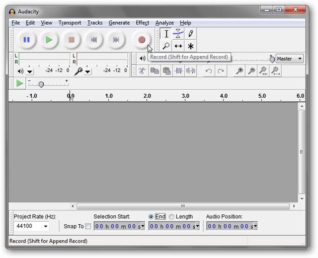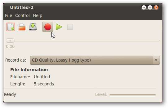 Saat program dimulai, Anda memiliki batu tulis kosong. Untuk merekam beberapa audio dari mikrofon Anda, klik pada tombol rekam merah.