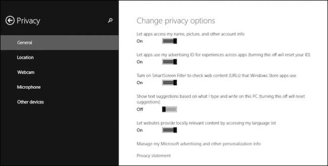 Di Windows 8.1, Anda bisa mengakses opsi Privasi dari pengaturan PC , yang berisi lima kategori: Umum, Lokasi, Kamera web, Mikrofon, dan Perangkat lainnya.