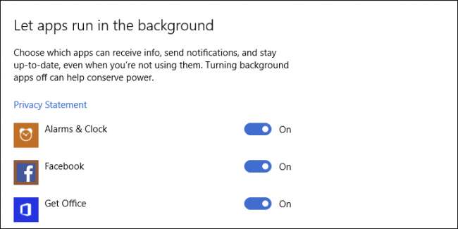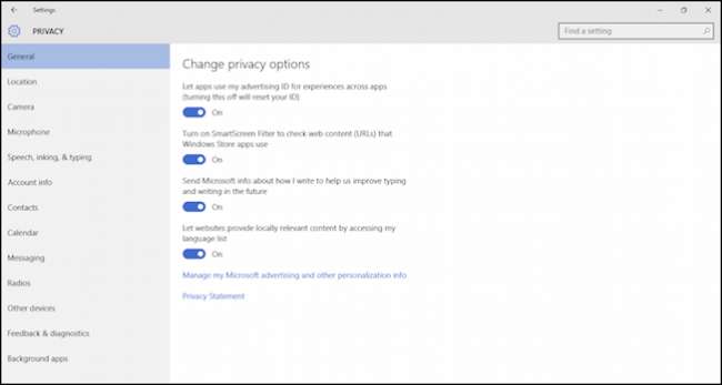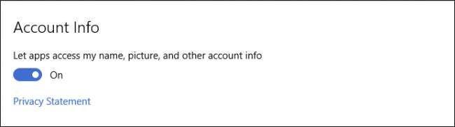 Pengaturan Umum sangat mirip dengan yang ditemukan di Windows 8.1, kecuali opsi untuk membiarkan aplikasi mengakses nama, gambar, dan informasi akun Anda telah dipindahkan ke bagian "Info Akun" sendiri.