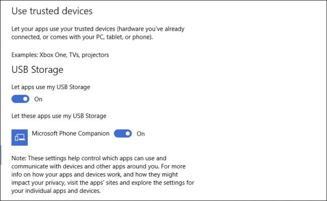 Di bawah, terdapat bagian untuk perangkat tepercaya (perangkat yang telah Anda sambungkan ke PC, tablet, atau ponsel), dan opsi untuk mencegah aplikasi menggunakan penyimpanan USB. Sekali lagi, Anda dapat memilih aplikasi mana yang dapat menggunakan penyimpanan USB, jika ada.