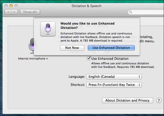 Aktifkan opsi Dikte yang Ditingkatkan dan Mac Anda akan mengunduh kamus yang sesuai dari server Apple. Ini kemudian akan dapat menafsirkan suara Anda secara offline. Jika Anda tidak mengaktifkan Dikte yang Ditingkatkan, ucapan Anda akan dikirim ke server Apple dan ditafsirkan di sana.