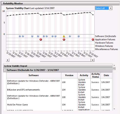 Anda dapat melacak seberapa stabil komputer Anda, berdasarkan jumlah kerusakan, dan Anda dapat memilih sejumlah besar tanggal untuk mendapatkan grafik yang bagus seperti yang Anda lihat di atas, yang mencakup informasi tentang berbagai kegagalan sistem, serta pemasangan dan pencopotan pemasangan perangkat lunak.