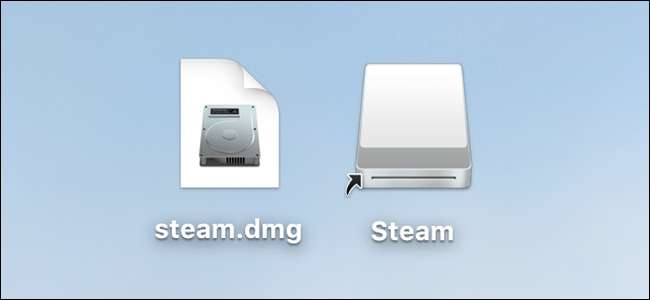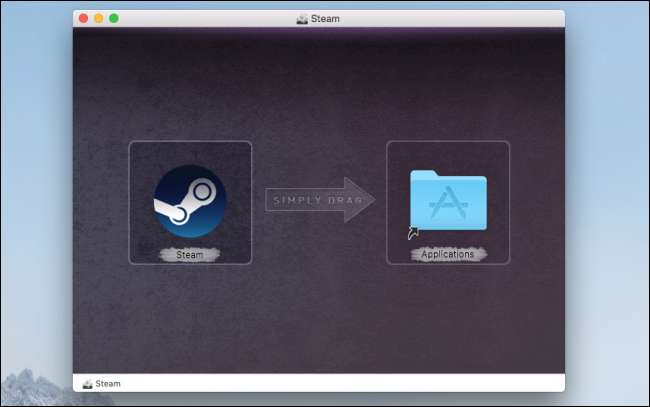 Saat Anda membuka file DMG, Anda biasanya akan melihat dua hal: aplikasi dan tautan ke folder aplikasi Anda. Beberapa DMG — seperti Steam DMG yang ditunjukkan di atas — memiliki latar belakang bergaya, tetapi ini hanya kosmetik.