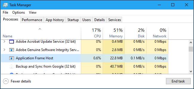 Anda sebenarnya tidak dapat menonaktifkan proses ini. Jika Anda mengklik kanan di Task Manager dan memilih "End Task", prosesnya akan ditutup. Semua aplikasi UWP atau Store Anda yang terbuka — jenis aplikasi baru yang disertakan dengan Windows 10 — juga akan ditutup. Namun, lain kali Anda membuka aplikasi UWP, Windows akan secara otomatis meluncurkan proses Host Bingkai Aplikasi sekali lagi. Ini dimulai sesuai kebutuhan Windows 10 di latar belakang, dan Anda tidak dapat menghentikannya.