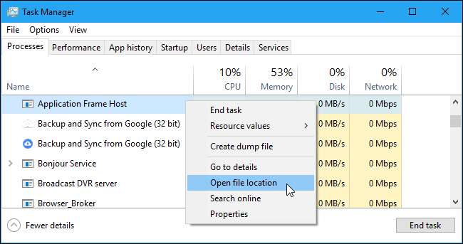 Untuk memeriksa apakah proses Application Frame Host yang berjalan di sistem Anda adalah yang asli, klik kanan di Task Manager dan pilih "Buka lokasi file".