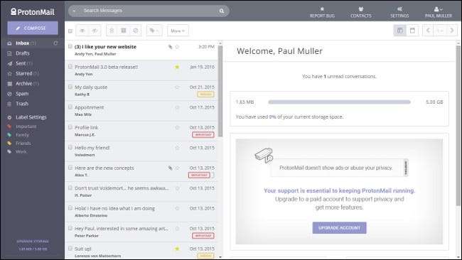 ProtonMail cukup terbatas oleh perbandingan. Akun gratis dibatasi hingga 500MB ruang dan 150 pesan sehari. Fitur yang gratis dengan Gmail, seperti filter khusus dan autoresponder, memerlukan akun premium € 4 / bulan. Anda mendapatkan tiga label, tiga folder, dan satu alamat (tidak ada domain khusus) secara gratis.