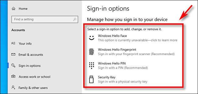 Di bagian atas halaman Opsi Masuk, Anda akan melihat daftar metode potensial Windows Hello Methods yang tercantum di bawah bagian "Kelola How You Masuk ke Perangkat Anda". Inilah yang mereka maksudkan.
