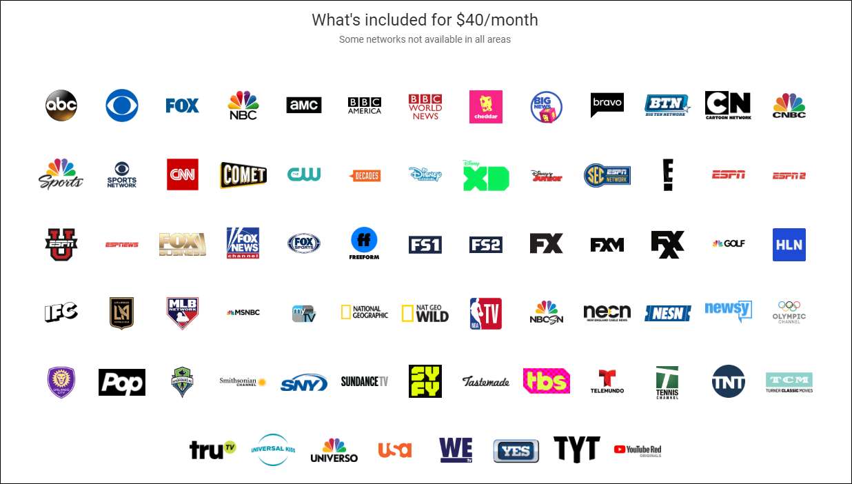 YouTube TV menawarkan tiga streaming simultan dengan akses di Android TV, Android, iOS, Apple TV, Samsung TV, LG TV, Chromecast, Roku, dan Xbox One.