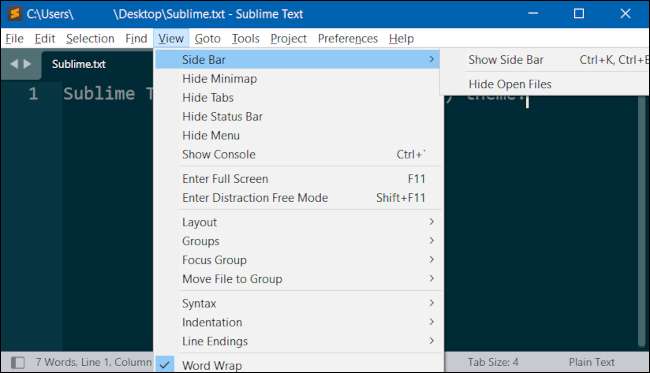 Sublime Text juga memiliki bilah sisi yang dapat Anda lihat dengan pergi ke menu atas dan memilih tampilan & gt; Sidebar & gt; Tampilkan bilah samping, atau dengan menggunakan pintasan keyboard Ctrl + K diikuti oleh Ctrl + B. Sidebar menunjukkan semua dokumen terbuka Anda, dan, seperti yang akan kita lihat dalam kiat yang akan datang, ini adalah cara yang bagus untuk melihat folder atau koleksi folder.