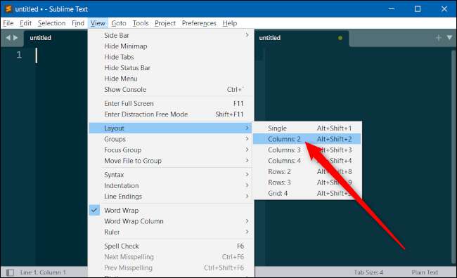 Jika Anda perlu membuka dan melihat banyak file sekaligus, Anda dapat membuka dua Windows, tetapi alternatif yang lebih mudah adalah menggunakan tampilan kolom Sublime. Dalam tampilan kolom, setiap kolom bertindak seperti jendelanya sendiri tetapi semua dalam satu jendela. Anda dapat memiliki hingga empat kolom, tetapi bagi kebanyakan orang, dua atau tiga kemungkinan yang Anda perlukan.