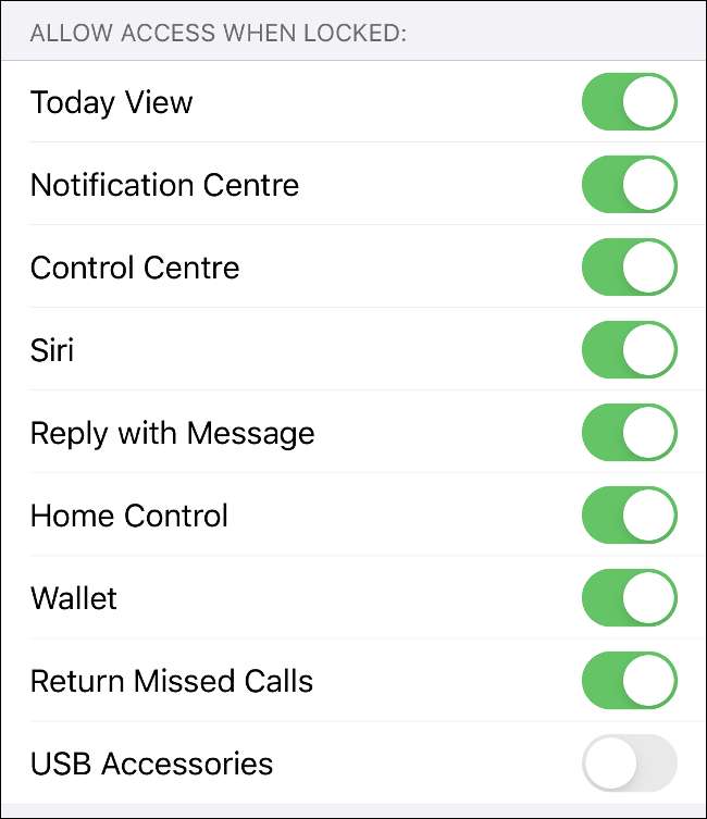 Dato che è così facile sbloccare il tuo iPhone o iPad, non è necessario fornire così tante informazioni mentre il dispositivo è bloccato. Vai su Impostazioni> Face ID e passcode (o Touch ID e passcode, a seconda del dispositivo) e disabilita tutti i servizi a cui non vuoi che altri accedano dalla schermata di blocco.