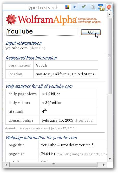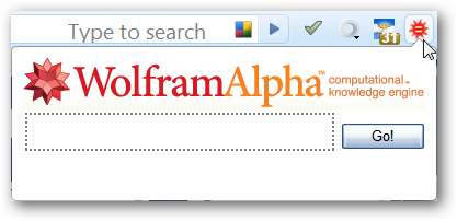 Per iniziare, fare clic sul "pulsante della barra degli strumenti". Ecco come apparirà la finestra a discesa ... inserisci il termine per il quale desideri effettuare una ricerca e premi "Invio" sulla tastiera o fai clic su "Vai!". Nota come il "pulsante della barra degli strumenti" appare "a riposo" ...