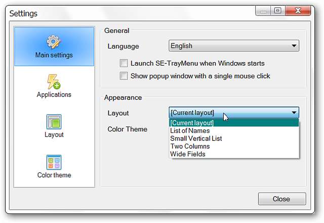 La prima cosa che probabilmente vorrai fare è decidere se desideri che SE-TrayMenu inizi con Windows ogni volta, il tipo di layout che meglio si adatta alle tue esigenze (puoi personalizzare l'aspetto di SE-TrayMenu con questo) e il tema del colore.