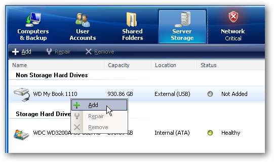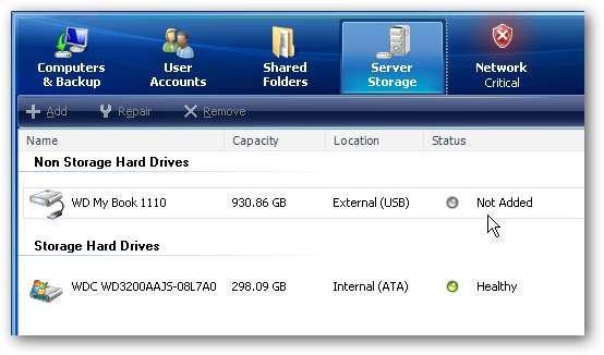 Collega il disco rigido esterno al server. Quindi apri la console di Windows Home Server da un altro computer sulla rete e vai su Server Storage. Dovresti vedere l'unità esterna nell'elenco, dove in questo esempio è un My Book da 1 TB di Western Digital. Noterai che lo stato dell'unità è Non ancora aggiunto.