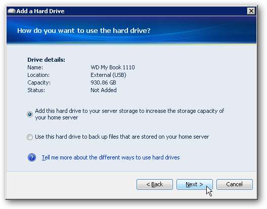 Nella fase successiva della procedura guidata che vogliamo selezionare Aggiungi questo disco rigido alla memoria del tuo server per aumentare la capacità di memoria del tuo server di casa . Se lo stavi aggiungendo come unità di backup per il server, seleziona la seconda opzione.
