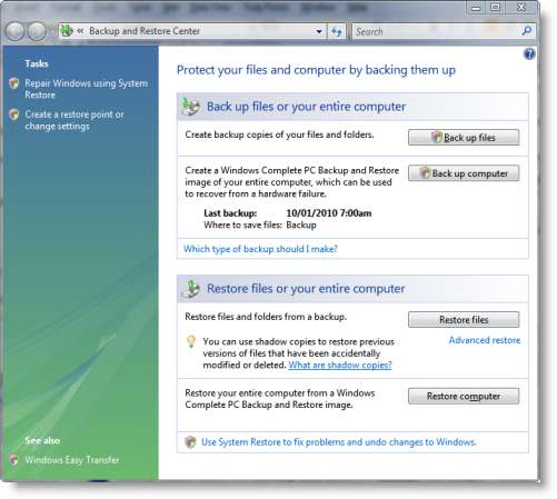 Il Centro backup e ripristino di Windows Vista ha introdotto agli utenti Windows la possibilità di eseguire il backup dell'intero computer: file, programmi, impostazioni, registro - .