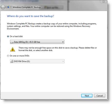 Questo file immagine VHD sarebbe in genere enorme (la dimensione combinata di tutti i file sull'unità C), quindi una posizione in cui archiviare questo file dovrebbe essere scelta con attenzione. Sfortunatamente, le uniche opzioni presentate erano altri dischi rigidi nel sistema (come un'unità D interna o un'unità USB esterna) o una raccolta di DVD vuoti.