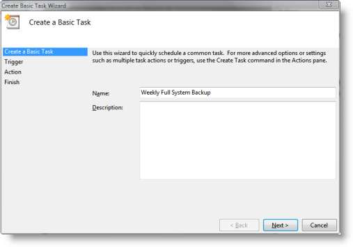 La Creazione guidata attività di base si avvia e ci richiede un nome con cui vorremmo fare riferimento a questa attività. Possiamo dargli un nome come "Weekly Full System Backup":