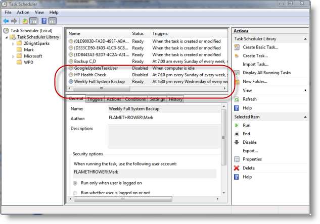 L'attività verrà ora eseguita ogni mercoledì mattina. Puoi anche eseguirlo manualmente ogni volta che vuoi aprendo l'Utilità di pianificazione di Windows, individuando l'attività nell'elenco e facendo clic sul pulsante Correre pulsante in Azioni riquadro a destra.