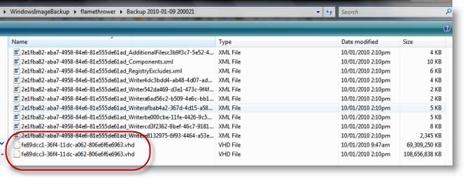 Una volta completata l'attività, è possibile accedere al computer / cartella di rete specificato nelle impostazioni dell'attività e visualizzare i risultati. Vedrai una cartella chiamata WindowsImageBackup e al suo interno una sottocartella con lo stesso nome del computer di cui stavi eseguendo il backup. Se esegui il backup di più macchine con questa tecnica, vedrai una sottocartella per ogni computer. All'interno di ogni sottocartella vedrai una sottocartella chiamata Backup con una data nel nome. È lì che si trovano i file di immagine, insieme ad alcuni file di manutenzione XML. I file di backup sono facili da identificare, poiché hanno dimensioni di molti Gigabyte e hanno un'estensione VHD.