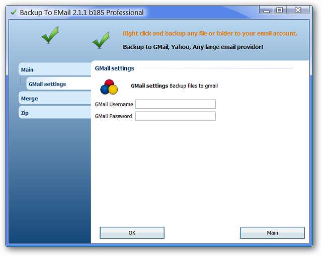 L'installazione di Backup To EMail è semplice e diretta. Una volta terminato il processo di installazione e avviato il programma, questa è la finestra che vedrai.