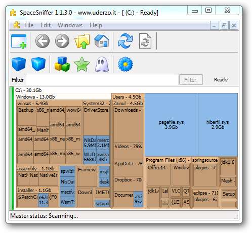 Prima di tutto scopriamo cosa sta monopolizzando il tuo disco rigido. Ti consigliamo di scaricare SpaceSniffer . Una volta avviato, mapperà il tuo disco rigido e mostrerà file e cartelle di grandi dimensioni nel tuo sistema. SpaceSniffer viene fornito con un manuale utente che ti mostra tutte le cose belle che puoi fare con SpaceSniffer.