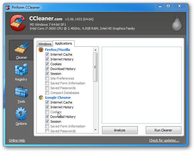 Vai alla scheda delle applicazioni e scoprirai che puoi rimuovere selettivamente i file non necessari da ciascuna applicazione. Ad esempio, puoi scegliere di pulire i cookie di Firefox, ma non quelli di Chrome.