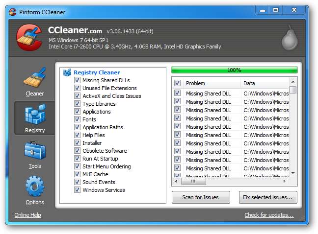 Windows mantiene una serie di file di registro che memorizza le impostazioni per il tuo PC, ad esempio lo sfondo che usi per il desktop. Ogni volta che disinstalliamo il programma, alcune associazioni di file inutilizzate potrebbero rimanere sospese nel registro e nel tempo il registro potrebbe gonfiarsi e rallentare il PC. CCleaner ti offre un modo semplice per pulire il tuo registro. Fare clic sull'icona del registro, eseguire una scansione dei problemi e fare clic sul pulsante "risolvi i problemi selezionati" per pulire il registro.